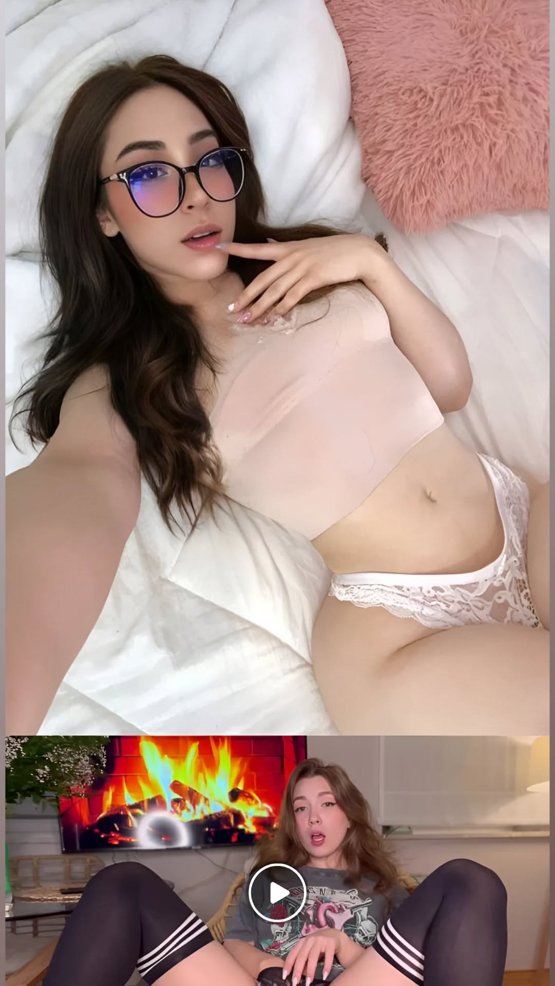 This may contain: a beautiful young woman laying on top of a bed next to a white wall and mirror